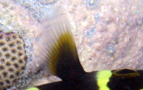 Pomacanthus paruThe juvenile French Angelfish looks very much like the juvenile Grey Angelfish. The French angelfish's tail has a yellow rim around the whole rounded tail and the Grey Angelfish's tail is squared off at the end and has a white or transparent edge (margin. The juvenile's body shape is almost triangular and as it grows becomes oval shaped. The adults are found in shallower water than the Grey Angelfish adults. The juveniles swim around protective areas in shallow water and act as cleaner fish for Bar Jacks and stingrays. They are also easier to approach than the Grey Angelfish.