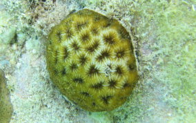 Favia fragumIt is easy to see how this dome shaped species got it's name. A colony is only about 2 inches in diameter and grows in shallow reefs and rocky shoreline areas. It is also known also "Star Coral" which is actually a general name for other stony corals like the Elliptical Star Coral and the Smooth Star Coral. Yellow/gold in color, the polyp holes, called Corallites, are oval with raised rims.
