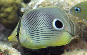 Chaetodon capistratusThe Foureye Butterflyfish get's it's name from the four eyes it's markings display. One real eye and one "false" eye on the rear of it's body. Perhaps it's to confuse a would be predator. If a predator's instinct is to strike at the front of the prey, the Foureye Butterflyfish's rear EYE fools the predator to strike from behind by mistake and the Butterflyfish makes his escape. As Juveniles they start out with six eyes, an extra spot on the rear of the dorsal fin that fades with age. Like most Butterflyfish, you generally see them in pairs. You can find the very small juveniles in water as shallow as two feet. They range in size from one inch to six inches.