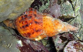 Charonia variegataAlso known as the Trumpet Snail and the West Indian Triton. You'll find these Trumpet snails in water as shallow as 3 feet. Most often under overhangs and in recesses but occasional out in the middle of a sea grass bed hunting for cushion stars or urchins. The last picture shows an Triton attacking and eating a Cushion Star. Large Tritons are one of the few predators of adult urchins and cushion stars. I've seen Tritons that measure from just couple inches long to over a foot in length. Their beautiful shells make them an easy target for over-collecting and have become rare in some places. Without these snails, sea stars and urchins can become over populated and cause an imbalance in nature. Giant Hermit Crabs will occupy vacant shells as well. Please leave wildlife in the wild. See my YouTube Video of a large Triton's Trumpet snail.