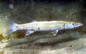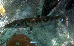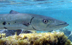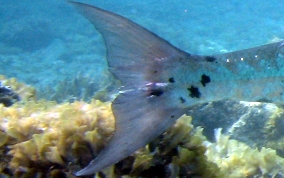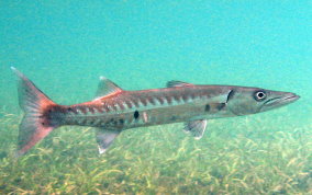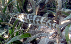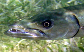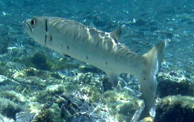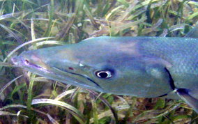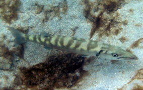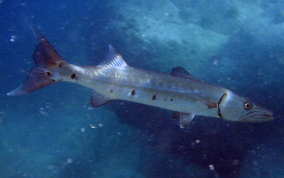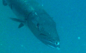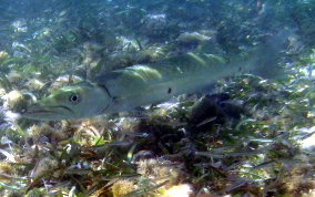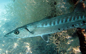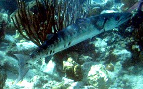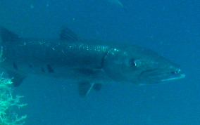 Sphyraena barracudaThe Great Barracuda may not be the largest fish you may encounter, but they are number one when it comes to looking menacing. Those huge jaws hold long spiked teeth that are slanted backwards. Whatever ends up in those powerful jaws has little hope of escape. The Barracuda's long thin profile and large tail add up to just one thing.... SPEED! I would lay odds that not too many fish that could out swim a barracuda in the short distance. Though they may look menacing, like eels, their mouths open and close in the course of respiration. As you can see from the pictures, they can appear very silvery, or quite dark., changing their body color to blend into their surroundings. I've oft times been surprised at how close I've come to them without noticing them and without them swimming away hurriedly. They just move slowly away., and sometimes, the very large ones will come back as if curious to know just what sort of creature I am. They are also territorial in nature.