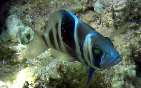 Hamlets tend to stay in a bit deeper water, five feet or so and deeper. They will hang around structures and gorgonians for protection and as long as they are not threatened, will generally stay put. They are tolerant only up to a point, if you come too close they will move off. I've seen them in most environments, from mangroves to clear, deeper rocky shoreline areas. The juveniles have two white spots at the tail base as in picture #1. Their bars can be very pale to very dark and often display of iridescent blue markings or spots