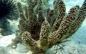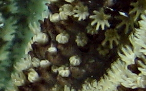 Plexaura homomallaBlack Sea Rod is an Octocoral similar to the Bent Sea Rod but Black Sea Rod grows in a bushy pattern rather than the flat single plane. The distinctive color of the yellow polyps protruding from black branches makes this species easy to identify. When the polyps are retracted the polyp's aperture rims are more flat then raised, so it is not considered a Knobby Sea Rod. The species grows in shallow waters, (4 feet) to deep water. (200 feet). Do not confuse Black Sea Rod with Black Coral, which are deep water Antipatharia. (cousins to sea anemones)