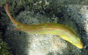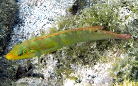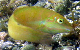 Halichoeres poeyiThe Black Ear Wrasse has a dark spot right behind their eyes and a neon green stripe just behind the dot, The Blackear Wrasse is more commonly found near turtle grass areas, (where their greenish yellow coloring helps them hide in the grass) and the nearby rubble strewn areas. They are appreciably wary.