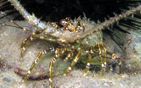 Panulirus argusLobsters are very gregarious. They seem to enjoy each other's company and are friendly and curious. tThey will come out to feel your hand with their antennae. They also protect their youngsters. See my YouTube Video on this surprising lobster behavior.Did you know that lobsters and other crustaceans molt their exoskeletons as they grow? It is thought that they build up water pressure inside their body in order to crack and shed the exoskeleton. The molting process takes only takes a few minutes for marine hermit crabs. They are then vulnerable until their new exoskeleton hardens. The crab will then eat the old exoskeleton. Doing so helps to recycle calcium and other minerals necessary for the new exoskeleton's health and rigidity. Caribbean Lobster's numbers have declined in some areas due to over harvesting.