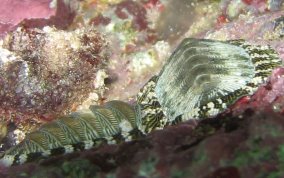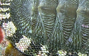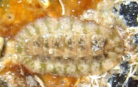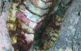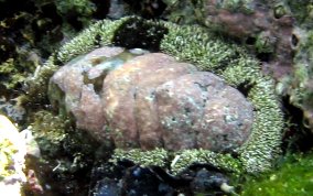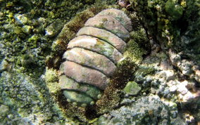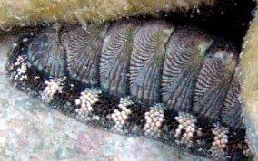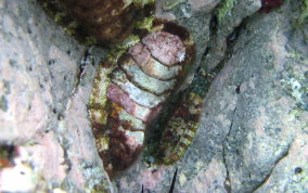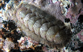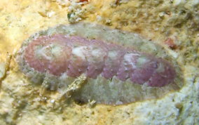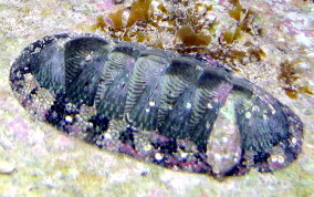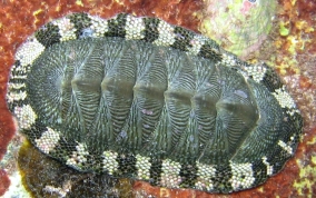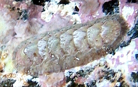 Class : AmphineuraThese Chitons may seem like simple creatures but they possess a heart and blood system, nerves, specialized sensory organs, a head, mouth, reproductive organs, digestive organ and an anus. There are over 800 known species. Some are carnivorous, feeding on sponges, bryozoans and other encrusting organisms and some are grazers, feeding on algae. They are fascinating animals. For more information, Go here ... (external link)