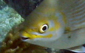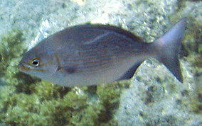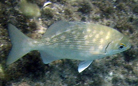 Kyphosus sectatrix/incisorEasily recognizes by their football shaped body. Generally all silver, but can display light grey spots on dark grey body or yellowish stripes on body and yellow marking on head and face. They can be found in areas of some surge at about 5 feet from surface. Generally found in small groups.