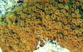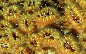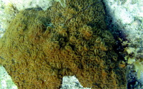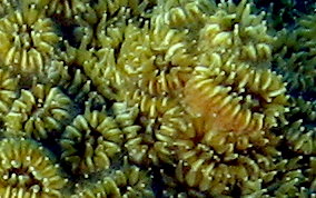 Dichocoenia stokesiiColonies of this coral grow in mound shape in water eight feet or deeper. They are easy to spot because of their uneven surface appearance. It's not smooth like the starlet corals and not grooved like the brain corals. The polyps are elliptical or Y shaped. The color is a yellowish brown. Found at depth of about 8 feet.