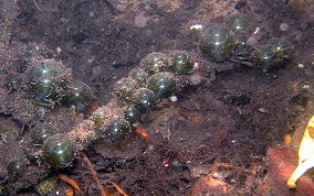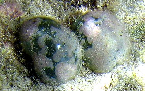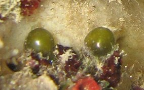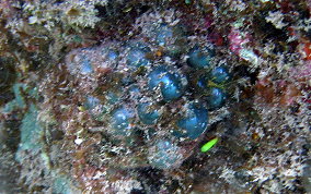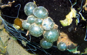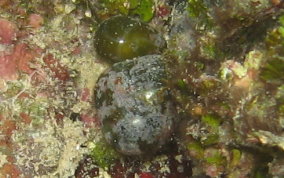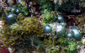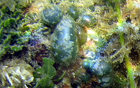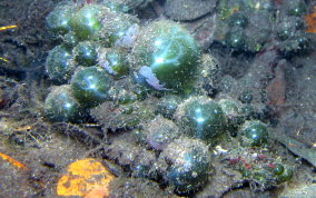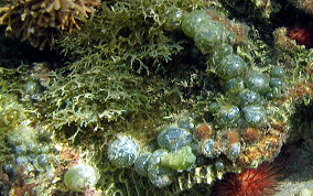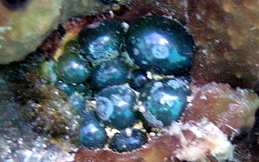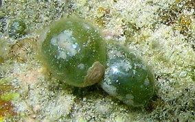 Valonia macrophysaThe Elongated Sea Pearl is a Green Algae. Groups grow in tight clusters in shady areas like north side of walls, under overhangs and in recesses. deeper than 2 feet. They are very similar to Sea Pearls but are smaller, growth to less than 1 inch in diameter. Because of the similarities of the two species, these photos are representations of the species based on descriptions of the species not based on microscopic identification. .