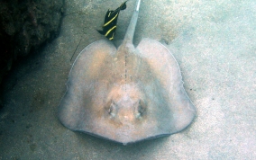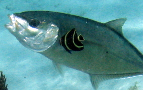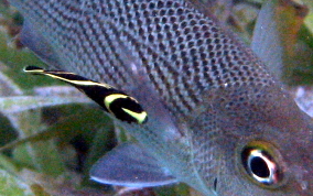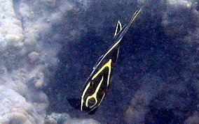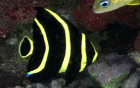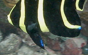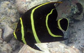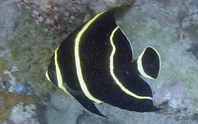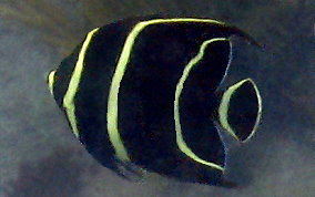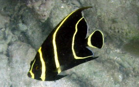 Pomacanthus paruThe juvenile French Angelfish looks very much like the juvenile Grey Angelfish. The French angelfish's tail has a yellow rim around the whole rounded tail and the Grey Angelfish's tail is squared off at the end and has a white or transparent edge (margin. The juvenile's body shape is almost triangular and as it grows becomes oval shaped. The adults are found in shallower water than the Grey Angelfish adults. The juveniles swim around protective areas in shallow water and act as cleaner fish for Bar Jacks and stingrays. They are also easier to approach than the Grey Angelfish.