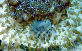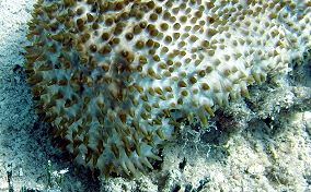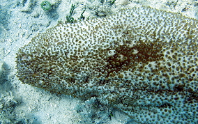 Astichopus multifidusOne of the larger sea cucumbers found in our waters. So called because the look furry and their skins look loose on their bodies. Their backs are blotched in brown or grey spikes and sometimes white contrasting colors. These were found in 10 or more feet of water on sandy bottoms.
