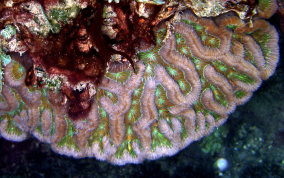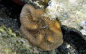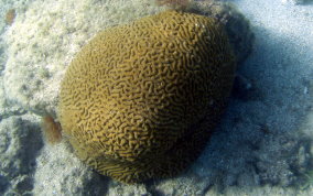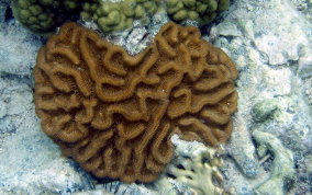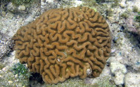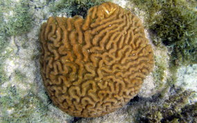 Colpophyllia natansThe Giant Brain Coral is actually the same species as the Boulder Brain Coral. The difference is what's known as "closed valleys" . The Giant brain Coral was previously classified separately, as C. breviserialis, but is now synonymous with the C. natans. These brain corals are believed to live for as long as 200 years, but at the same time are found to be susceptible to more coral diseases than most other corals in its habitat. Along with plankton caught from the water stream by the coral polyp's tentacles, the boulder brain corals share their structures with an algae that, through photosynthesis, grows and provides an additional nutrients for the coral. Since sunlight is required for photosynthesis, the fastest growing corals live at or very near the surface. Brain corals are a major contributor to the reef building process. The ridges are a generally brown in color and the valley can be white/grey, green or tan. They can grow to over 4 feet in diameter.