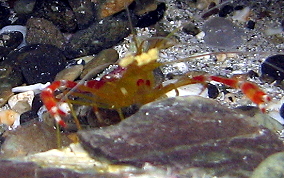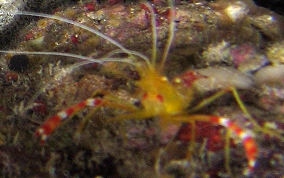Stenopus scutellatusSimilar to the Banded Coral Shrimp. These are cleaner shrimp and are uncommon. Look just under overhangs and in recesses. The two pairs of thin white antennae will be the first indication of their presence. They are usually on the ceilings. It is their middle legs that grow the big claws, not the first pair as crabs do. Much of their bodies are translucent.