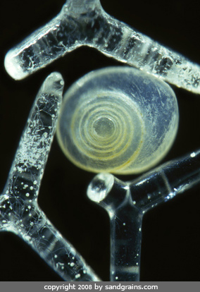 Three sponge spicules surround a blue spiral sand grain. Sponge spicules are the internal skeleton of most species of sponges. They are made of silica.