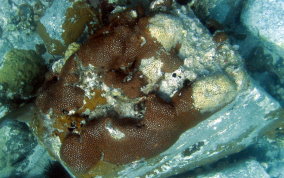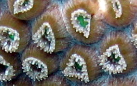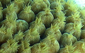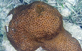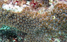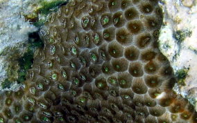 Montestrea cavernosaGreat Star Coral colonies can be found in water as shallow as 3 feet but most often deeper than 8 feet. They are easy to distinguish from othe star corals because of the large coral polyps. Polyps can be either extended or retracted during the day. The colony structure is usually a round or dome shape. You can find them growing on a sandy bottom or along rocky shorelines but they can also encrust a flat surface or sides of walls. Their color can range from dark brown to lime green with centers often a contrasting or bright color.