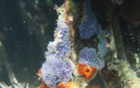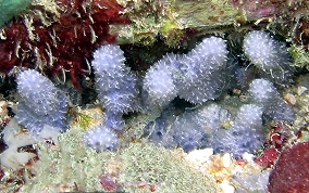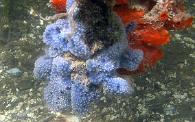Dysidea etheriaThis Blue/purple sponge is found in a variety of environments. Find them attached to mangrove roots, and other bays with rocky shorelines that have a lot of sediment or on the floor of sea grass beds. This beautiful sponge has a network of incurrent areas and widely spaced excurrent openings. Most are no more than a few inches across. Found at depths around 2-4 feet. Colors blue, lavender.
