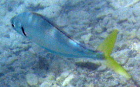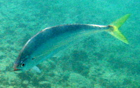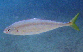 Oligoplites saurusThe Leatherjacket is a member of the Jack family of fishes. They are elongated, silvery with bright yellow tails. The dorsal and anal spines are connected to venomous glands so caution should be used when handling this species should you happen to catch one if you are out fishing. Little is known about the properties of this venom, but a puncture can be a painful wound. I always see them in bays when the water is turbid, never in clear water. They feed on small fish and squid. they are also known as Needlejack, Shoemaker and Macheral. They school near the surface and cruise the bays and inlets.