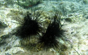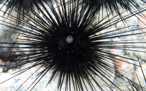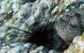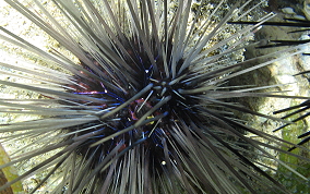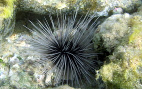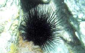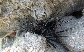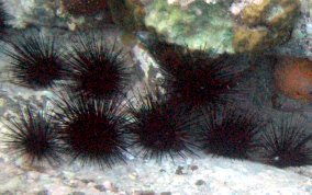 Diadema antillarumAlso also known as the lime urchin, black sea urchin or the long-spined sea urchin.There actually seems to me to be long spine sea urchins and medium spined sea urchins. See pics 4 & 5. Some seem to have more but shorter spines others fewer, but longer spines . They are sensitive to their surroundings. Pass your hand over them between them and the sunlight and watch their reaction. Sometimes they will point their spines up...as two are doing in picture 9. Sea Urchins are eaten in some parts of the world including their gonads and roe. One of the most disliked, ignored and avoided creatures in our sea is the long spine sea urchin. Taking a closer look at this important member of the reef community reveals a marvelous example of nature's engineering. The next time you find an urchin in shallow water, take the opportunity to learn more. When you pass your hand past the urchin, they will follow your hand with their spines. That is because this species has eye spots (not all urchins do). Try to position yourself so the sun shines on the urchin and you can see the five plates that make up the endoskeleton and the spine's base structure. Without urchins there would be no coral reefs. Urchins of all species are grazers that clean solid substrates of algae so new coral polyps, especially stony corals like brain and elkhorn, have a clean surface to adhere to and grow. In 1983, these urchins underwent a mass die-off, with more than 97% of the urchins dying. As a result, Caribbean reefs have been overgrown by algae which has an overall negative effect on coral reef health and resistance to other stress factors. There are still areas here on St. John that could benefit from urchin research and relocation. Places like Maho, Chocolate Hole, and Francis Bay have serious algae problems. Read more about what other places have been doing to restore healthy urchin populations.