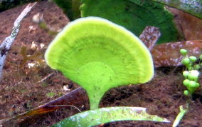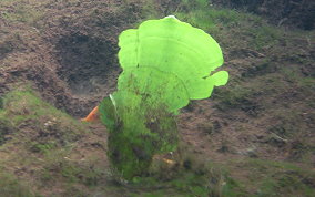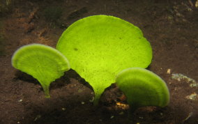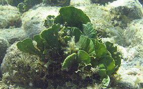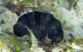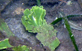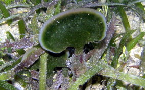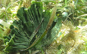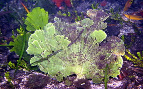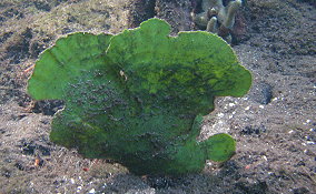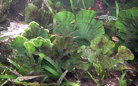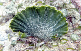 Udotea spp.The Mermaid's Fan is a Green Algae. The several species here represent a few of the types found in sandy sea floor environments, the silty bottoms of the mangroves and in areas of rock and rubble. It seems there is a species that tolerates full daylight and those that do well in shady areas. There is the flat paddle-like fan, the accordian folded and the double layered grown patterns. These are not plants in the strict sense of the word.