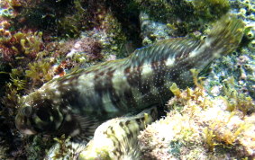 Scartella cristataThe Molly Miller is a failry large blenny (four inches) and a member of what is called Combtooth Blennies. If you notice, they have red and white banded 'cirri" on the top of their head. The cirri are not branched like the Hairy Blenny's but like teeth of a comb. These two were found in about 1 foot of water on the back side of some rocks in a fairly high surge area. This couple had a Night Sergeant for a neighbor.