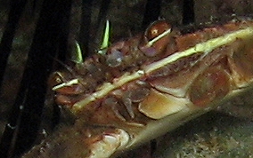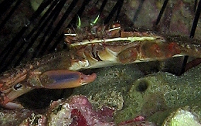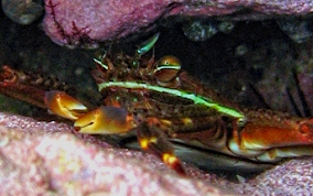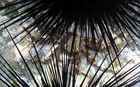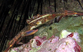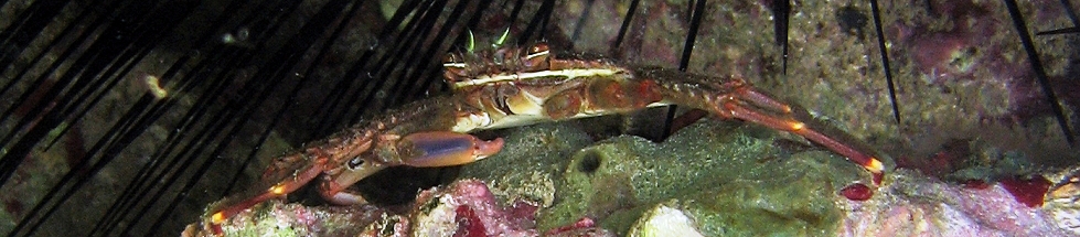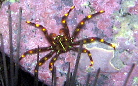 Percnon gibbesiIf you want to find one of these strange-faced crabs, just scan around Long Spine Sea Urchins. They hide under the spines and venture out only as far as necessary to forage for food. They are very quick to retreat when something disturbs them. Because of their common association with the urchin, they are sometime referred to as "Urchin Crabs". Like the Yellowline Arrow Crab, the Nimble Spray's leg joints also shine like iridescent gold. You will see more of them toward sunset.