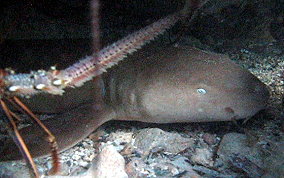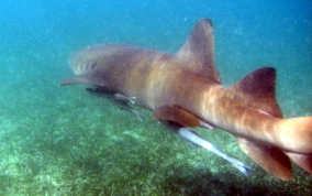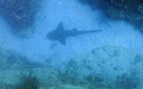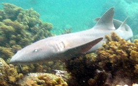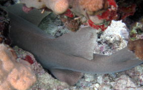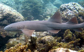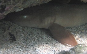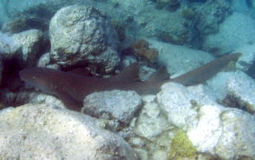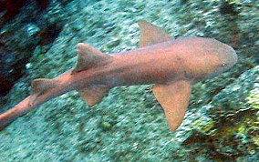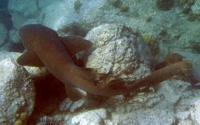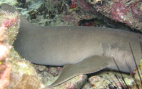 Ginglymostoma cirratumNurse sharks often will rest during the day in protected areas. Nurse sharks don't have a lower lob on their tails and their heads are the widest part of their body. They are night feeders and have two short barbels on their upper lip that they use to find their food. They eat fish, stingray, mollusks (like squid and octopi) and crustaceans. Lemon sharks and tiger sharks feed on nurse sharks. Although generally considered a docile species, Nurse Sharks do have teeth (not like other sharks, though) and can bite severely if provoked. Average length: 7-9 feet. Here in the Caribbean they are also known as the "Cat Shark" because of their resemblance to the catfish. For more info Go Here (external Link)