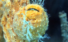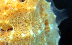 Ulosa ruetzleriOrange sponge that encrusts. Has the appearance of fine netting over the body of the sponge. The excurant openings are transparent white. Do not confuse with the Orange Icing Sponge. Not highly common. Found in a variety of environments from reef crevaces to mangrove roots.