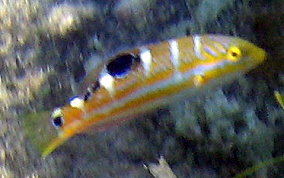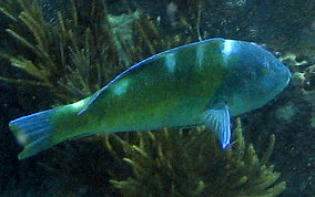 Halichoeres radiatusThe largest wrasse in the Caribbean, growing to a maximum of a foot and a half long. While the juveniles can be found in rather shallow water the large adults migrate to deeper waters of ten to fifty feet. Like most wrasse, who are constantly in motion, they are extremely difficult to get close to. As you can see, the juveniles look very different than the adults. The terminal phase (adult males) are solid blue/green without the 5 white body bars.