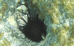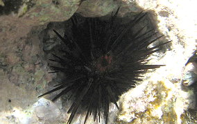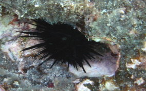 Echinometra lucunter lucunterVery common in shallow water. They bore protective holes in the rocks and dead coral for protection during the day and feed on algae during the night. Although it seems like they never move, when disturbed it's quite amazing both how and how fast they can move. They have short, thick, pointed spines. they average about 2 inches in diameter.