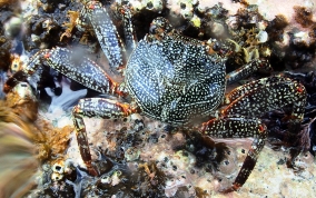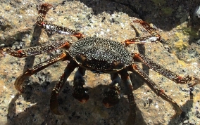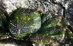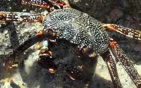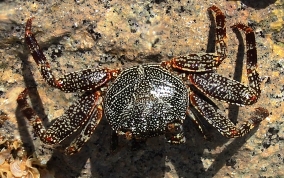 Grapsus grapsusRound Carapace with rows of white or bluish white speckles, no margin teeth on edge of carapace.. Base color is dark or chocolate/coffee brown. Leg joints maroon/rusty color. Two small claws. They inhabit the the spray zone of rocky shorelines and can move very quickly along the rocks. Some may be covered with a green fine algae.