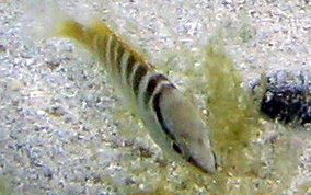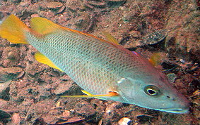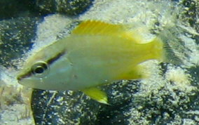 Lutjanus apodusA curious fish that seems to get himself into the picture on many occasions. They seem to be the most populous of the snappers. Juveniles can be easily confused with the Dog Snapper when in a reddish color phase. Schoolmasters can change their appearance from stripped to mottled very quickly. They may have the nose through the eye strip on their heads similar to the Gray Snapper, but the Gray Snapper never has body bars. They can also be confused with the Cubera Snapper because of the body bars, but the Cubera snapper never has yellow fins. See my YouTube Video of a Schoolmaster.