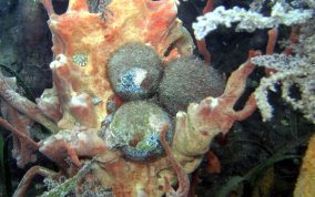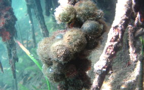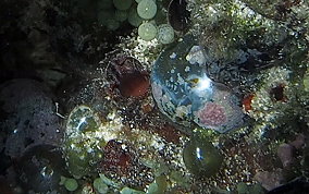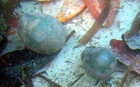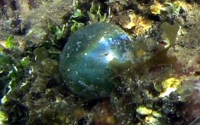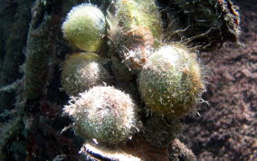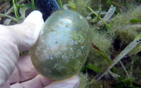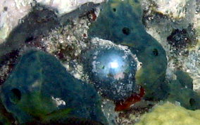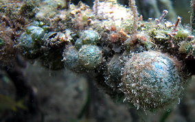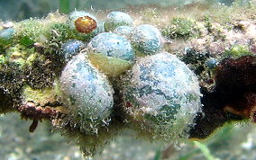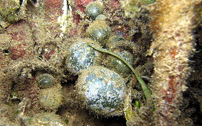 Ventricaria ventricosaThe Sea Pearl is a Green Algae and known elsewhere as "Sailor's Eyeball". The Sea Pearl is one of the largest unicellular, or single cell organisms, in the world. The Sea Pearls are usually found as solitary organisms, or in small groups, attaching themselves by thin filaments to subsurfaces, or are found free floating. They are very similar to Elongated Sea Pearls which grow in tight clusters in shady areas like north side of walls, under overhangs and in recesses. Sea Pearls can grow to a diameter of 2 inches.