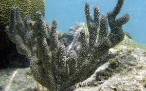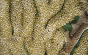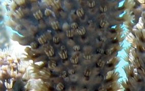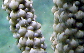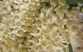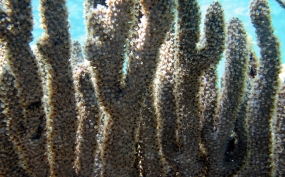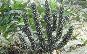 Eunicea succineaOne of the knobby sea rods, the Shelf Knob is one of a family of Octocorals whose polyps build calyces that look like little shelves protruding from the branches. The outside edge of the rim is often upturned like a little hook. Most of the species on this page are of the type that grow in a candelabrum-shape. Colors are mostly yellow-green, greenish-grey or grayish brown with matching polyp colors. They inhabit both shallow waters (3 feet) to deeper (50 feet) waters.