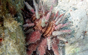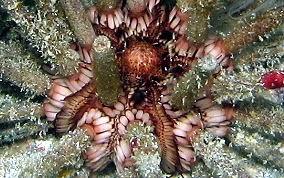 Eucidaris tribuloidesA beautiful urchin with thick blunt spines. the spines, unless newly grown or most often covered with various organisms and algae. They have a unique, 5 point, woven design on the top and 5 beak-like teeth on the underside. Average diameter including spines 5 inches. Look for them at most depths. They can be found in areas of rubble, sea grass beds and reefs. Often wedged between rocks and other recesses. Colors brown, tan, rust.