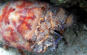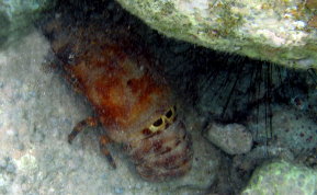 Scyllarides aequinoctialisIf you see what looks like a moving rock with a couple large dark spots at mid-back, you've probably spotted one of these Slipper Lobsters. Hide during the day and forage at night. You may catch a glimps of one just after sunrise or a bit before sundown. They grow to about a foot long. They are pretty tolerant if you can approach them. I=one of these was in water about 3 feet deep, the other in about 10 feet. Not what you are looking for? Try the Spotted Spiny Lobster.