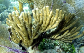 Muricea muricataThe spiny Sea Fan doesn't look like the other Sea Fans, it looks more like a sea rod. At close range you can see why it's called spiny. Short and branching in a plane, the Spiny Sea Rod grows in shallow as well as 60 foot depths. They are always a golden hay color. The first picture is not the typical Spiny Sea Fan appearance. This could be either the Spiny Sea Fan, but is a bit taller than the norm, or it could be an Open Spiny Sea Fan, which is uncommon in this region. Microscopic examination would be required. Usual height is just about a foot tall,.