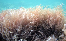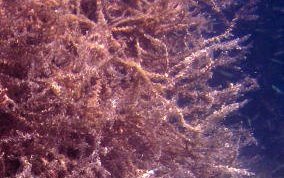 Pinkish or tan-buff seaweed that attaches to mangrove roots, rocks and other hard substrates. Named for the spiny filaments that protrude from branch ends.
