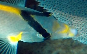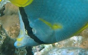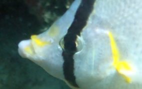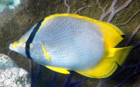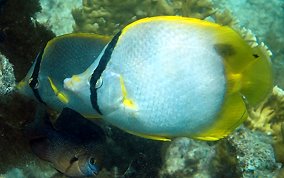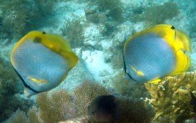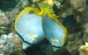 Chaetodon ocellatusSince this butterfly fish likes deeper water and is quite shy, sightings while snorkeling may be very uncommon. Once you find them you will be able to find them again, because mated pairs remain in a territory that they defend from intruders. They are the largest of our butterflyfishes, growing to almost 8 inches. The small black spot on the rear top of the dorsal fin is how it got its name. The large, round blotch that is noticeable on the rear of the body on one pair is a worm infestation known as Black Ick. The pair has the infestation on the very same place on each of them. Butterflyfish use their tiny mouths to feed on coral polyps. When all our coral dies, what will happen to these beautiful jewels of the reef?