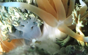Lebrunia danaeThis anemone has two types of tentacles. During the day you'll see the short multi-forked tentacles which are the pseudo-tentacles or false tentacles. The second type, the true un-branched tentacles, (Shown in first three, rare daytime photos) usually only come out at night and are longer and tapered. Found in shallow waters of 3-8 feet. ,