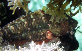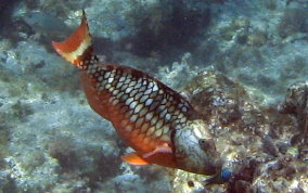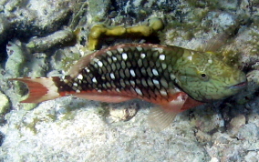 Sparisoma virideThe Stoplight Parrotfish is one of the most recognizable of the parrotfishes. Their unmistakable white spot phase with their bright red belly is hard to mistake for anything else. The Terminal Phase (a sexually mature male) coloring looks entirely different. (represented in the bottom photos) They can grow to almost 2 feet in length.
