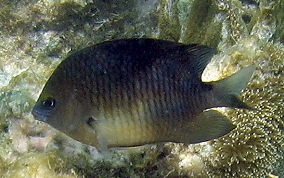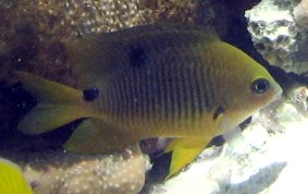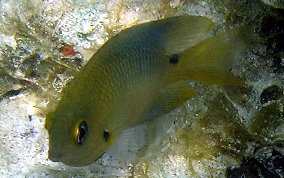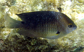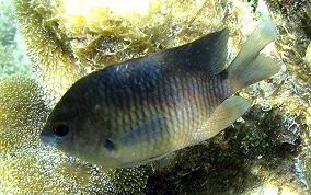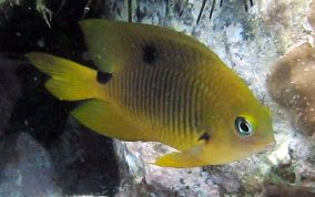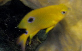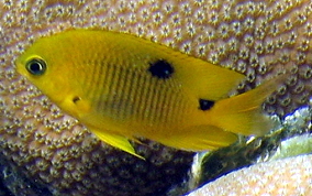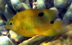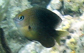 Stegastes planifronsThe easiest way to tell an adult Threespot Damselfish is by their gold "eyebrows" and blue lips. The black spot on the top of their tail area (just before the tailfin) is also a good way to tell them from other adult Damselfish. These Damselfish like clear water and can be populous in some areas and absent in other. They are territorial and protect their turf, an area of reef or fire coral mound.