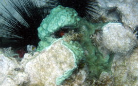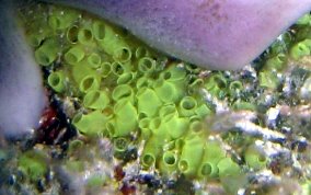 CLASS: AscidiaceaTunicates are one of the most interesting populous species, but almost always overlooked. They come in a variety of colors, shapes and sizes, from the very small 1/4" , to the larger 3-4 inch giant tunicate . Some of the tunicates seen around St. John I have not been able to identify. If you see something and don't know what it is, it may be a tunicate . Some tunicates are also known as Sea Squirts. The adults are sessile, meaning, they spend their lives permanently attached to one place. They are suspension feeders, waiting for their food source to pass by where it is drawn into the body and utilized. There are over 2,000 known species of tunicates, some of which have been around for some 1.7 million years. Although tunicates seem like very simple creatures, they have a nervous system, stomach, heart and sex organs. Their two siphons are used to "siphon" water into the body cavity where food particles are filtered from the water by the pharynx, (which makes up most of the body), then passed into the digestive system. Although tunicates have no backbone, they are related to other vertebrate (those with a backbone) animals because they had a backbone in their pelagic state.