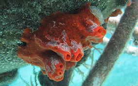 Tedania klausi/ Tedania ignisAt one time the Volcano Sponge and the Fire Sponge were thought to be the same species. They have now been classified as two separate species. They are still hard to tell apart. These pictures are not scientifically identified, but I know from experience that these pictured sponges leave irritating, burning areas on your skin if touched.