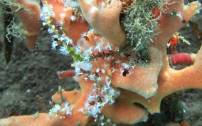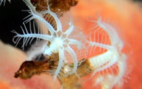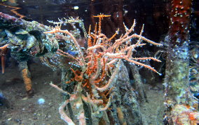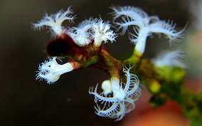 Carijoa riiseiRarely seen in shallow waters. Long untangled stalks with one polyp on the end and secondary polyps grow lower on stem. Bright white polyps stems usually overgrowm with sponges, algae or other encrusting organisms. Usually the first coral (octocoral) to be established on sunken vessels. Habitate range from O-180 feet. Caribbean White Telesto differs genetically from the fouling, invasive species in Hawaii that is genetically similar to the White Telesto originating from the Indo-Pacific region.