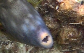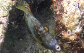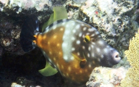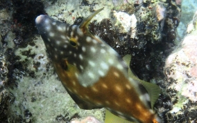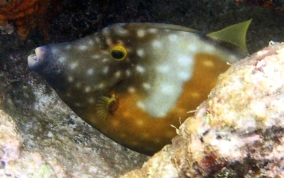 Cantherhines macrocerusThey can change their appearance rapidly. Here are their different displays. They have a large fore dorsal spine that they can raise and lower. Note the double-hook orange spines at the tail base and the single "tooth" on the upper and lower mouth. They also a dewlap (extendable belly flap) that they extend and retract. They are a medium size filefish, growing upwards to 1.5 feet.