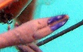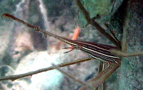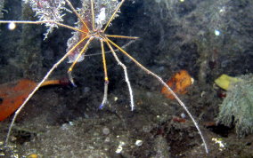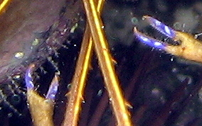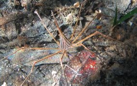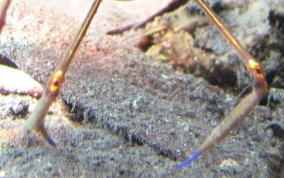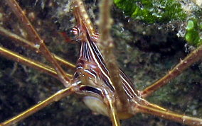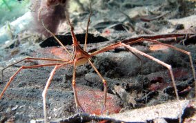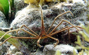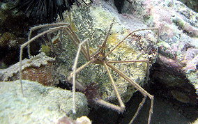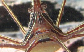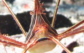 Stenorhynchus seticornisThe is no mistaking this long-legged crab. Although his triangular shaped body is relatively small, his legs can reach almost 4 inches in length. His front knee-caps glow like gold and his claws are an almost iridescent blue. Fairly shy, but one of the few crabs that are out and about during the daylight hours. Using a slow approach you can get quite close. Found in most environments and has been observed in a symbiotic relationship with a Magnificent Feather Duster worm, using the worm as cover protection. See my YouTube Video of a Yellowline Arrow Crab wooing a Magnificent Feather-duster Worm.