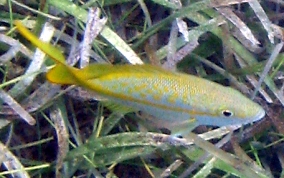Ocyurus chrysurusProbably the least shy of all the snappers except the Grey Snapper. I also see them out in the open during the day(more often then the other snappers), cruising around and over reefs. Most often seen alone when they get older, but the juveniles will school together for feeding frenzies. Look for the large yellow body strip coming from the tail all the way to the eye and a tail that has a very deep fork. Sometimes have a blue sheen and/or yellow spots on their bodies above the mid-line.