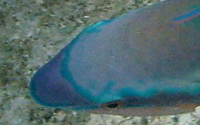 Scarus isertiMore common than the Princess Parrotfish, the Stripped Parrotfish juveniles have well defined stripes from nose to tail and have a yellow smudge on their nose and blue coloring above the eye. when males become sexually mature their coloring changes. See bottom photos. They can grow to just under a foot in length. Juveniles can be seen in back water areas and rocky shorelines where they school with a mixture of other species of juveniles. Occasionally seen schooling for grazing. The Terminal Phase of the Striped Parrotfish looks very similar to the Princess Parrotfish.