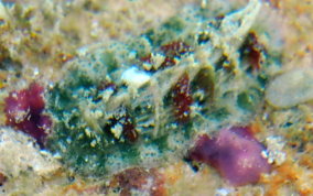 Class : AmphineuraThese Chitons may seem like simple creatures but they possess a heart and blood system, nerves, specialized sensory organs, a head, mouth, reproductive organs, digestive organ and an anus. There are over 800 known species. Some are carnivorous, feeding on sponges, bryozoans and other encrusting organisms and some are grazers, feeding on algae. They are fascinating animals. For more information, Go here ... (external link)