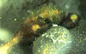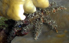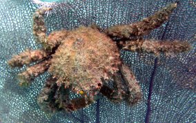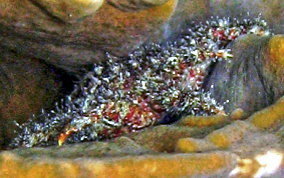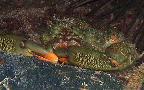Mithrax ssp.Clinging Crabs seem to be everywhere. From very tiny half inch sized ones to the formidable seven inch Channel Crab. All have one thing in common, equal sized, smooth claws with blunt tips. Most of these pictures were taken in less than than six feet of water.